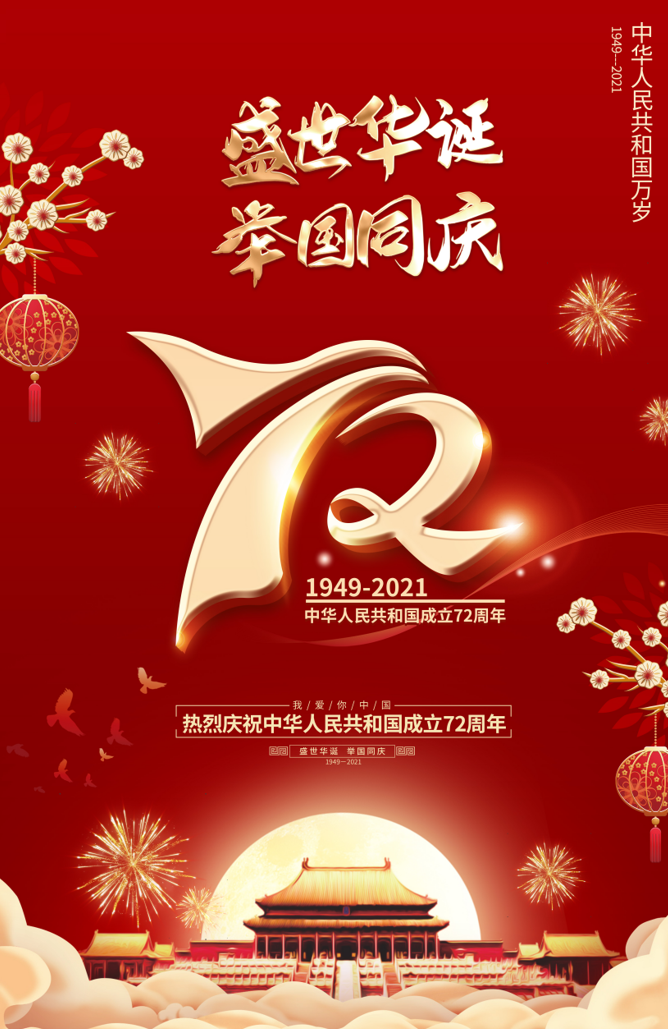 金秋十秋迎国庆,璀璨喜气耀大地万顷碧波国兴旺,家居乐业百家欢:万紫千红普天庆,祝福似雨满天酒:祝福祖国永昌盛,繁荣富强更辉煌。在这里我们携全体员工祝祖国72周年生日快乐!
